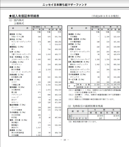 投資信託に組み入れられた銘柄は「運用報告書」で見ることができます。「運用報告書」の「組入資産の明細」を見てみましょう。また、その投資信託がベビーファンドとマザーファンドを組み合わせたファミリーファンド方式の場合は、「運用報告書」後半部分の「組入有価証券明細表」で確認することができます。