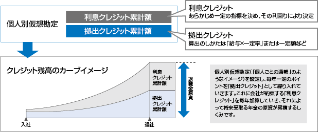 まず従業員ごとに“仮の口座”(管理上設ける口座で、実際に振り込まれるわけではない)が作られます。企業はその口座に、一定のルールに基づいて拠出クレジットを付与します。ここまでは確定拠出年金と似ていますが、違うのはこの口座には利息クレジット(簡単にいうと運用利率)も付与され、拠出クレジットはその利息クレジットによって運用される点です。したがって、確定拠出年金のように従業員本人が運用することはありません。